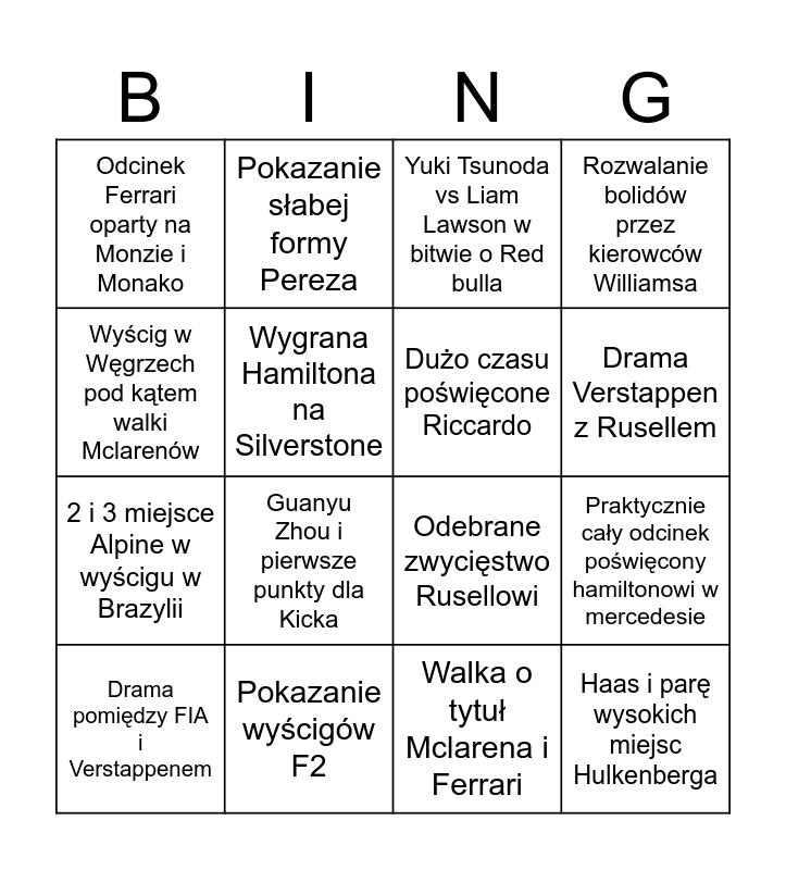This bingo card has 16 words: Pokazanie wyścigów F2, Praktycznie cały odcinek poświęcony hamiltonowi w mercedesie, Yuki Tsunoda vs Liam Lawson w bitwie o Red bulla, Odcinek Ferrari oparty na Monzie i Monako, 2 i 3 miejsce Alpine w wyścigu w Brazylii, Pokazanie słabej formy Pereza, Odebrane zwycięstwo Rusellowi, Walka o tytuł Mclarena i Ferrari, Wyścig w Węgrzech pod kątem walki Mclarenów, Wygrana Hamiltona na Silverstone, Drama pomiędzy FIA i Verstappenem, Rozwalanie bolidów przez kierowców Williamsa, Guanyu Zhou i pierwsze punkty dla Kicka, Drama Verstappen z Rusellem, Dużo czasu poświęcone Riccardo and Haas i parę wysokich miejsc Hulkenberga.
