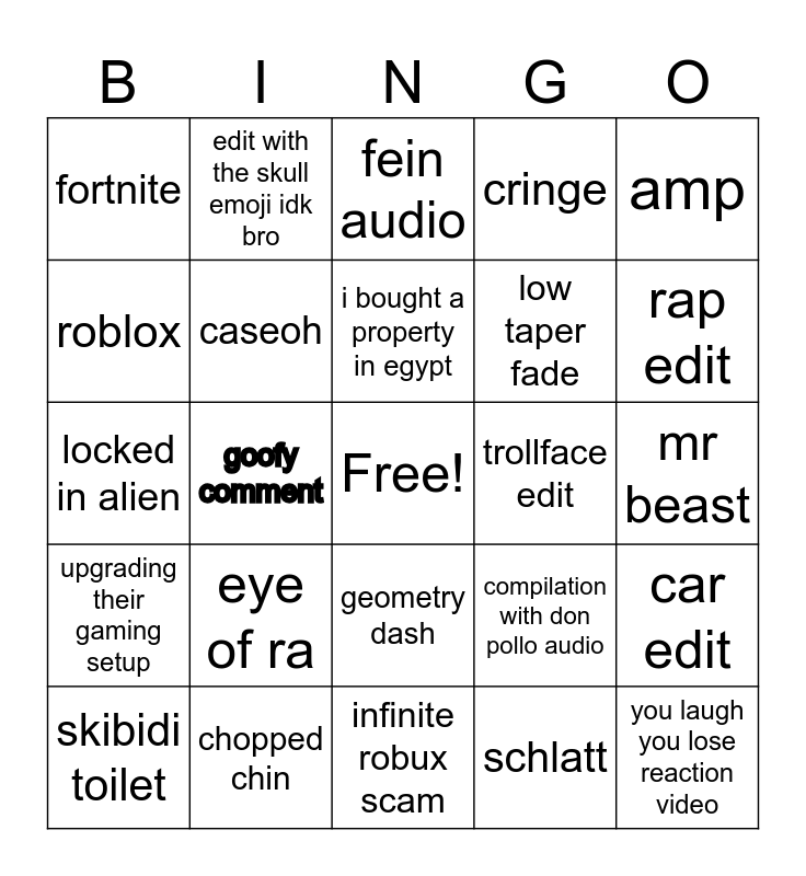 This bingo card has a free space and 24 words: eye of ra, chopped chin, i bought a property in egypt, skibidi toilet, amp, fortnite, roblox, edit with the skull emoji idk bro, trollface edit, geometry dash, low taper fade, locked in alien, compilation with don pollo audio, car edit, caseoh, schlatt, mr beast, fein audio, rap edit, goofy comment, you laugh you lose reaction video, upgrading their gaming setup, cringe and infinite robux scam.