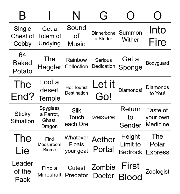 This bingo card has 36 words: Sticky Situation, Spyglass a Parrot, Ghast, Dragon, Cutest Predator, Serious Dedication, Diamonds!, Diamonds to You!, Single Chest of Cobby, Find a Mineshaft, Sound of Music, Aether Portal, Get a Sponge, Into Fire, The Lie, Loot a desert Temple, Rainbow Collection, Dinnerbone a Strider, Height Limit to Bedrock, Taste of your own Medicine, 64 Baked Potato, The Haggler, Silk Touch each Ore, Overpowered, Return to Sender, The Polar Express, The End?, Get a Totem of Undying, Hot Tourist Destination, Zombie Doctor, Summon Wither, Bodyguard, Leader of the Pack, Find Mooshroom Biome, Whatever Floats your goat, Let it Go!, First Blood and Zoologist.
