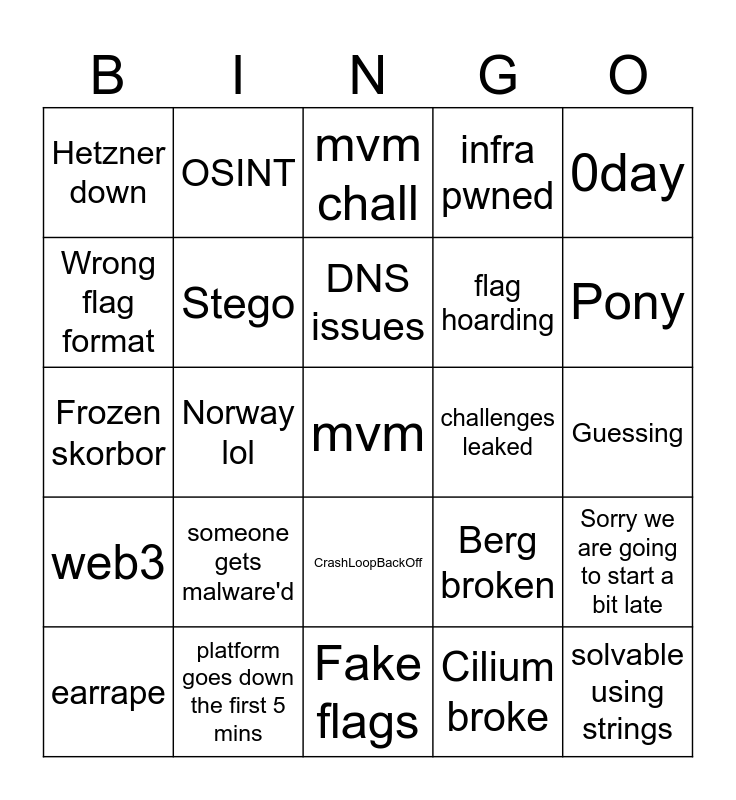 This bingo card has a free space and 24 words: someone gets malware'd, platform goes down the first 5 mins, DNS issues, earrape, 0day, Hetzner down, Wrong flag format, OSINT, challenges leaked, CrashLoopBackOff, flag hoarding, Frozen skorbor, Berg broken, Sorry we are going to start a bit late, Stego, Cilium broke, Guessing, mvm chall, Pony, Norway lol, solvable using strings, web3, infra pwned and Fake flags.