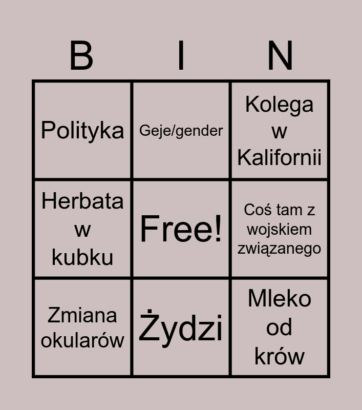 This bingo card has a free space and 8 words: Herbata w kubku, Geje/gender, Coś tam z wojskiem związanego, Zmiana okularów, Kolega w Kalifornii, Polityka, Żydzi and Mleko od krów.
