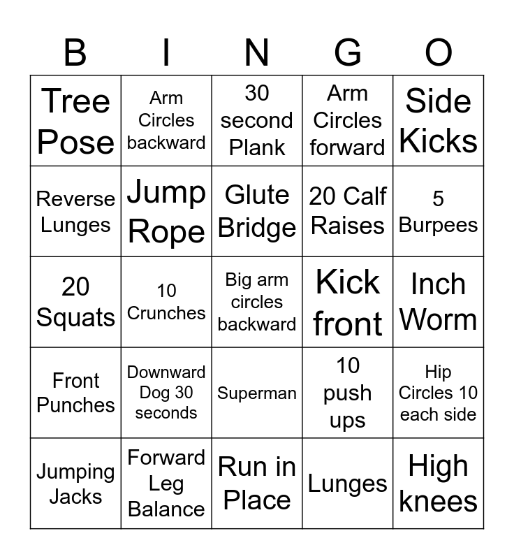 This bingo card has a free space and 29 words: Jumping Jacks, 10 Sumo Squats, 10 Crunches, Donkey Kick, Tree Pose, 30 second Plank, Jump Rope, Downward Dog 30 seconds, Kick front, Forward Leg Balance, Inch Worm, High knees, Run in Place, Lunges, 5 Burpees, Skaters, Superman, Front Punches, Side Kicks, 20 Squats, 10 push ups, Pulse squats, 20 Calf Raises, Reverse Lunges, Arm Circles forward, Arm Circles backward, Hip Circles 10 each side, Glute Bridge and Big Arm Circles forward.