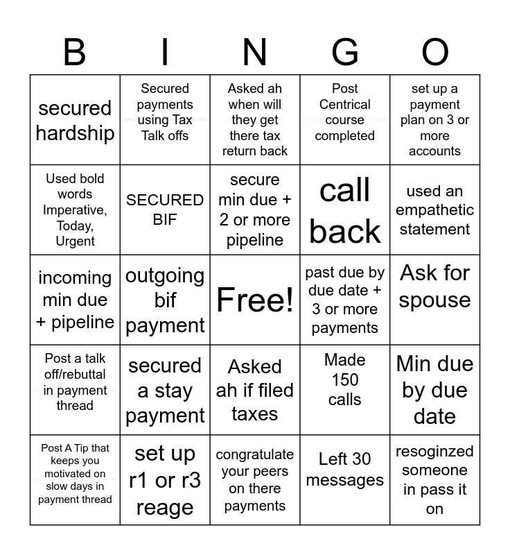 This bingo card has 7 images, a free space and 24 words: Post A Tip that keeps you motivated on slow days in payment thread, secured a stay payment, secure min due + 2 or more pipeline, Left 30 messages, set up a payment plan on 3 or more accounts, secured hardship, Secured payments using Tax Talk offs, Asked ah when will they get there tax return back, past due by due date + 3 or more payments, Ask for spouse, incoming min due + pipeline, SECURED BIF, Made 150 calls, Min due by due date, Used bold words Imperative, Today, Urgent, set up r1 or r3 reage, congratulate your peers on there payments, Post Centrical course completed, used an empathetic statement, Post a talk off/rebuttal in payment thread, outgoing bif payment, Asked ah if filed taxes, call back and resoginzed someone in pass it on.