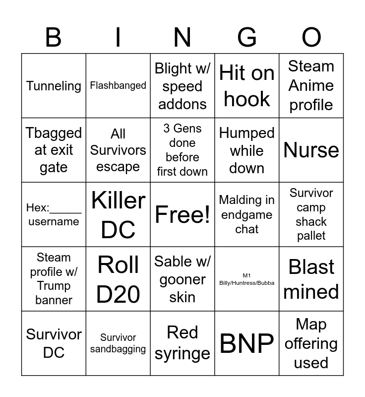 This bingo card has a free space and 29 words: Survivor DC, Survivor go next, Killer DC, ECouple, Tunneling, Blight w/ speed addons, All Survivors escape, Roll D20, Malding in endgame chat, Survivor sandbagging, Survivor camp shack pallet, Map offering used, Red syringe, BNP, Nurse, Proxy Camping, Sable w/ gooner skin, Steam profile w/ Trump banner, Steam Anime profile, Hex:_____ username, M1 Billy/Huntress/Bubba, Chucky, Humped while down, Tbagged at exit gate, Hit on hook, Flashbanged, Blast mined, 3 Gens done before first down and Clown.