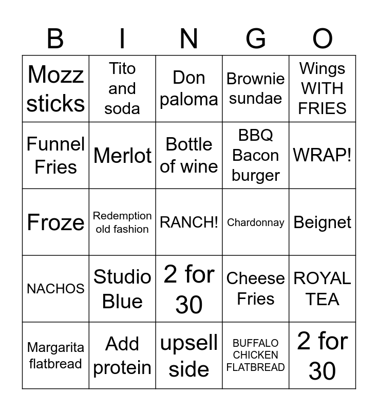 This bingo card has a free space and 24 words: Studio Blue, Add protein, Bottle of wine, Margarita flatbread, Wings WITH FRIES, Mozz sticks, Funnel Fries, Tito and soda, Chardonnay, 2 for 30, BBQ Bacon burger, Froze, Cheese Fries, ROYAL TEA, Merlot, BUFFALO CHICKEN FLATBREAD, Beignet, Don paloma, WRAP!, Redemption old fashion, 2 for 30, NACHOS, Brownie sundae and upsell side.