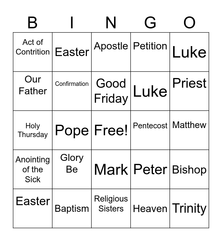 This bingo card has a free space and 79 words: Sacraments, Mass, Apostle, Disciple, Heaven, Eucharist, Holy Orders, Reconciliation, John the Baptist, Baptism, Marriage, Anointing of the Sick, Petition, Act of Contrition, Hail Mary, Our Father, Rosary, Glory Be, Bless Us O Lord, Matthew, Mark, Luke, Holy Thursday, Good Friday, Confirmation, Epiphany, John the Evangelist, Peter, Pope, Bishop, Priest, Deacon, Religious Sisters, Christmas, Easter, Pentecost, Ascension, Annunciation, Grace, Trinity, Trinity, Grace, Annunciation, Ascension, Pentecost, Easter, Christmas, Religious Sisters, Deacon, Priest, Bishop, Pope, Peter, John the Evangelist, Epiphany, Good Friday, Holy Thursday, Confirmation, Sacraments, Mark, Luke, Matthew, Bless Us O Lord, Glory Be, Hail Mary, Our Father, Rosary, Petition, Marriage, Anointing of the Sick, Baptism, John the Baptist, Reconciliation, Holy Orders, Eucharist, Heaven, Sacraments, Disciples and Act of Contrition.