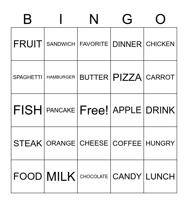 This bingo card has a free space and 29 words: FOOD, HOTDOG, PANCAKE, BACON, FRUIT, FAVORITE, HAMBURGER, ORANGE, APPLE, MILK, DRINK, LUNCH, CHOCOLATE, CANDY, CARROT, EGG, CHEESE, STEAK, CHICKEN, FISH, COFFEE, FRENCHFRY, PIZZA, SPAGHETTI, DINNER, SANDWICH, HUNGRY, BUTTER and LASAGNA.