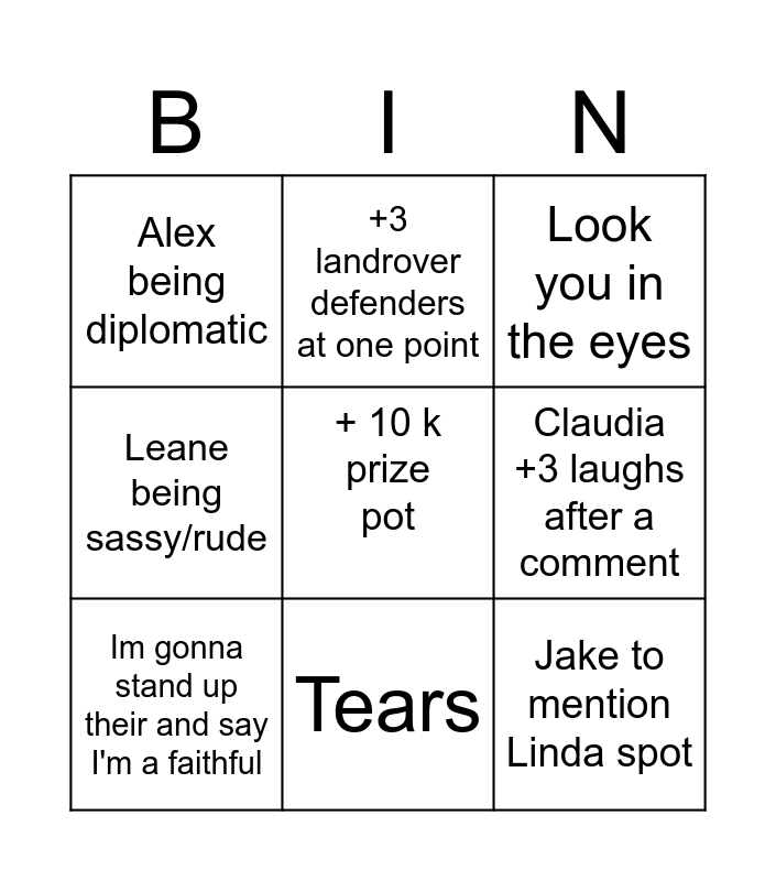 This bingo card has a free space and 17 words: Spelling name wrong, Im voting for yourself, Look you in the eyes, Alex being diplomatic, Ive got an itch, Leane being sassy/rude, Alex having an autistic fit, Im gonna stand up their and say I'm a faithful, Tears, Claudia +3 laughs after a comment, Croissant eaten at breakfast, Sob story, Jake to mention Linda spot, +3 landrover defenders at one point, Frankie wearing a scarf, Swearing and Traitor slip up.
