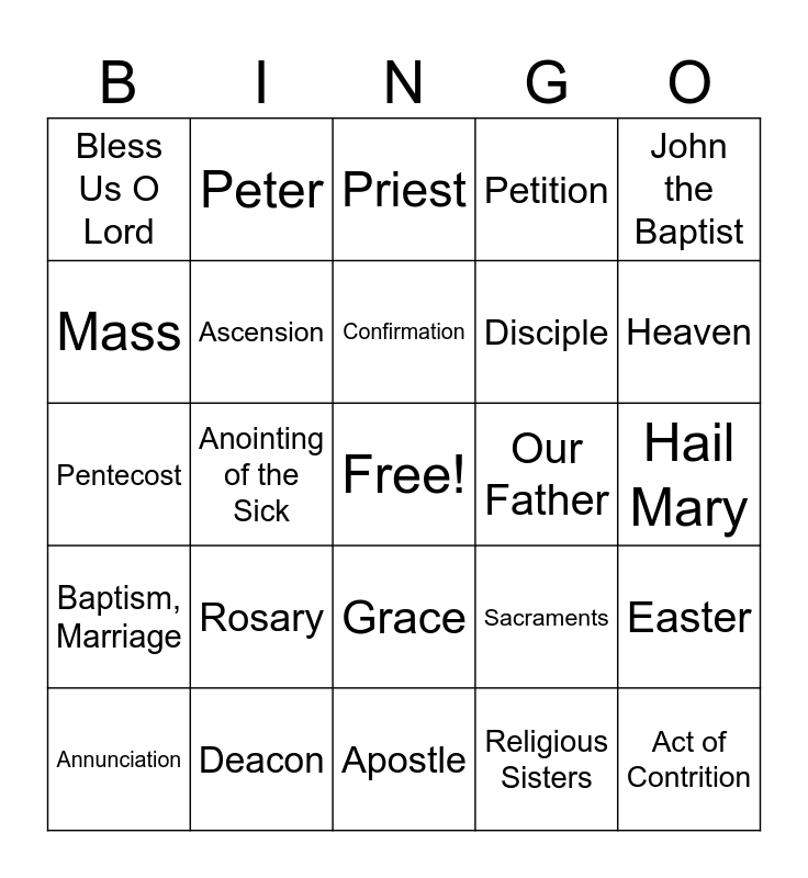 This bingo card has a free space and 39 words: Reconciliation, Holy Thursday, Good Friday, Ascension, Annunciation, Grace, Confirmation, Epiphany, John the Baptist, Baptism, Marriage, Anointing of the Sick, Petition, Act of Contrition, Hail Mary, Our Father, Rosary, Glory Be, Bless Us O Lord, Matthew, Sacraments, Mass, Apostle, Disciple, Heaven, Eucharist, Holy Orders, Mark, Luke, John the Evangelist, Peter, Pope, Bishop, Priest, Deacon, Religious Sisters, Christmas, Easter, Pentecost and Trinity.