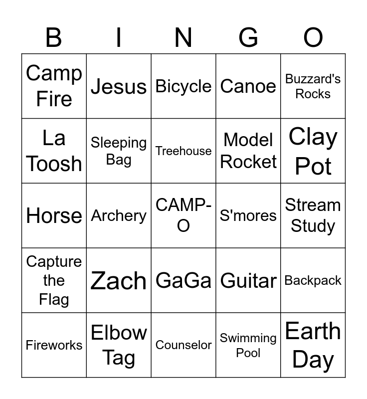 This bingo card has a free space and 24 words: Zach, Elbow Tag, Treehouse, Fireworks, Buzzard's Rocks, Camp Fire, La Toosh, Jesus, S'mores, GaGa, Model Rocket, Horse, Guitar, Backpack, Sleeping Bag, Swimming Pool, Stream Study, Bicycle, Clay Pot, Archery, Earth Day, Capture the Flag, Canoe and Counselor.