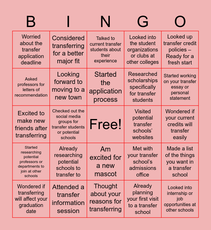 This bingo card has a free space and 24 words: Already researching potential schools to transfer to, Attended a transfer information session, Started the application process, Wondered if transferring will affect your graduation date, Looked up transfer credit policies –Ready for a fresh start, Worried about the transfer application deadline, Asked professors for letters of recommendation, Considered transferring for a better major fit, Visited potential transfer schools’ websites, Am excited for a new mascot, Researched scholarships specifically for transfer students, Excited to make new friends after transferring, Met with your transfer school’s admissions office, Made a list of the things you want in a transfer school, Looking forward to moving to a new town, Already planning your first visit to a transfer school, Wondered if your current credits will transfer easily, Talked to current transfer students about their experience, Started working on your transfer essay or personal statement, Checked out the social media groups for transfer students or potential schools, Looked into internship or job opportunities at other schools, Started researching potential professors or departments to join at other schools, Looked into the student organizations or clubs at other colleges and Thought about your reasons for transferring.