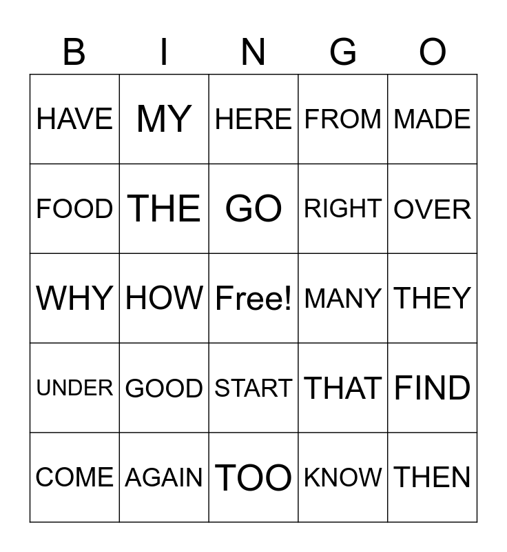 This bingo card has a free space and 24 words: GOOD, AGAIN, GO, COME, MADE, HAVE, FOOD, MY, MANY, START, RIGHT, WHY, THAT, FIND, THE, KNOW, THEY, HERE, OVER, HOW, THEN, UNDER, FROM and TOO.