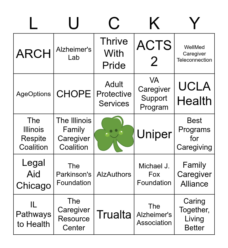 This bingo card has a free space and 27 words: Michael J. Fox Foundation, Care Compare, VA Caregiver Support Program, Trualta, AgeOptions, Thrive With Pride, Alzheimer's Lab, Legal Aid Chicago, Uniper, Family Caregiver Alliance, The Illinois Respite Coalition, ACTS 2, IL Pathways to Health, The Caregiver Resource Center, UCLA Health, Community Resource Finder, CHOPE, Adult Protective Services, The Parkinson's Foundation, ARCH, Best Programs for Caregiving, The Alzheimer's Association, The Illinois Family Caregiver Coalition, Caring Together, Living Better, AlzAuthors, WellMed Caregiver Teleconnection and The American Cancer Society.