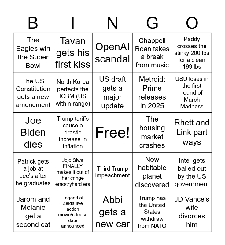 This bingo card has a free space and 24 words: Jojo Siwa FINALLY makes it out of her cringe emo/tryhard era, Legend of Zelda live action movie/release date announced, US draft gets a major update, Jarom and Melanie get a second cat, Paddy crosses the stinky 200 lbs for a clean 199 lbs, The Eagles win the Super Bowl, The US Constitution gets a new amendment, Tavan gets his first kiss, The housing market crashes, Third Trump impeachment, Metroid: Prime releases in 2025, Joe Biden dies, New habitable planet discovered, Intel gets bailed out by the US government, North Korea perfects the ICBM (US within range), Trump has the United States withdraw from NATO, Rhett and Link part ways, OpenAI scandal, USU loses in the first round of March Madness, Trump tariffs cause a drastic increase in inflation, JD Vance's wife divorces him, Patrick gets a job at Lee's after he graduates, Chappell Roan takes a break from music and Abbi gets a new car.