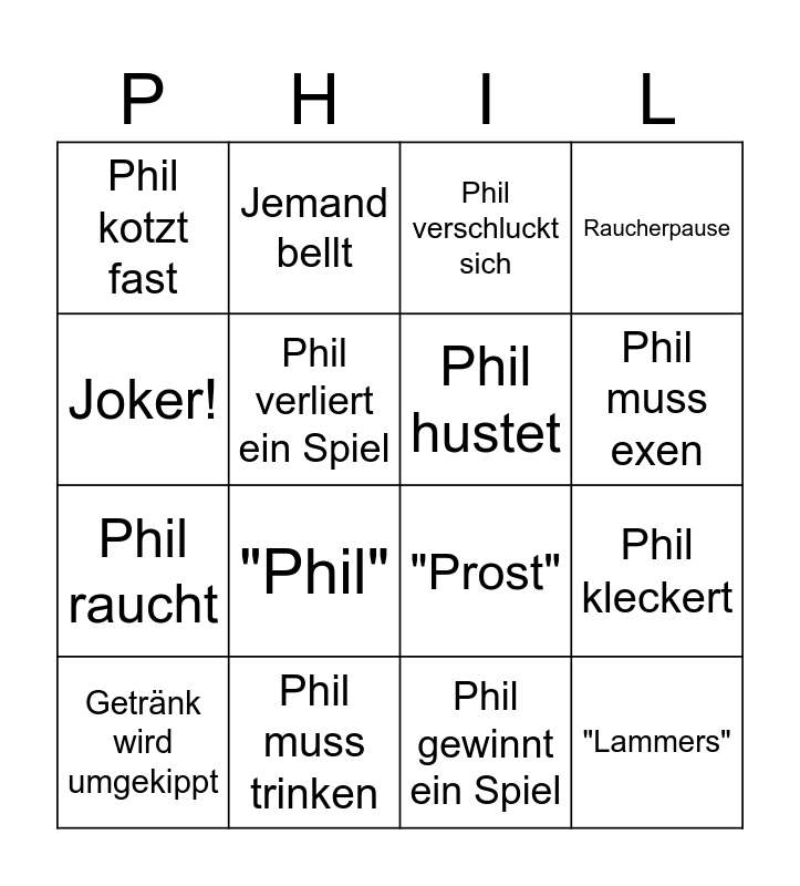 This bingo card has 16 words: Phil muss trinken, Phil kleckert, Phil verschluckt sich, Phil kotzt fast, Phil raucht, Jemand bellt, "Prost", Phil gewinnt ein Spiel, Joker!, Phil verliert ein Spiel, Getränk wird umgekippt, Raucherpause, "Phil", Phil muss exen, Phil hustet and "Lammers".