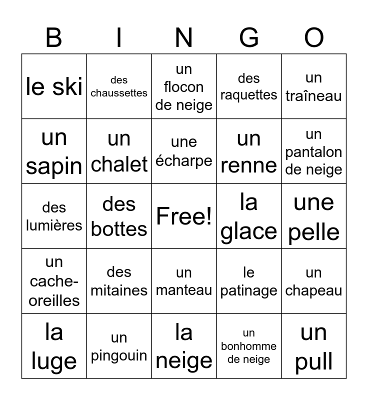 This bingo card has a free space and 32 words: un bonhomme de neige, un bonnet, des bottes, une boule de neige, un cache-oreilles, un chalet, un traîneau, un chapeau, des chaussettes, du chocolat chaud, une écharpe, un flocon de neige, l’hiver, des gants, la glace, un igloo, la luge, des lumières, un manteau, des mitaines, le patinage, des patins, une pelle, un pingouin, un pull, des raquettes, un renne, un sapin, le ski, la neige, un ours polaire and un pantalon de neige.