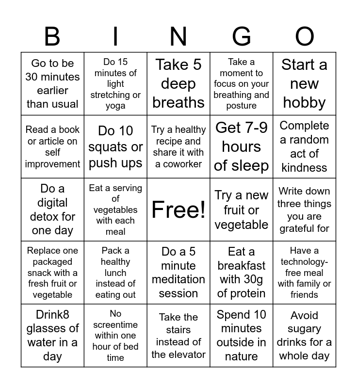 This bingo card has a free space and 29 words: Drink8 glasses of water in a day, Take a 10-minute walk during your break, Eat a serving of vegetables with each meal, Stretch for 5 minutes, Go to be 30 minutes earlier than usual, Take 5 deep breaths, Do 10 squats or push ups, Pack a healthy lunch instead of eating out, Try a new fruit or vegetable, No screentime within one hour of bed time, Write down three things you are grateful for, Avoid sugary drinks for a whole day, Take the stairs instead of the elevator, Spend 10 minutes outside in nature, Complete a random act of kindness, Listen to your favorite uplifting music, Do a 5 minute meditation session, Replace one packaged snack with a fresh fruit or vegetable, Start a new hobby, Do a digital detox for one day, Eat a breakfast with 30g of protein, Write your coworker an encouraging note, Get 7-9 hours of sleep, Read a book or article on self improvement, Take a moment to focus on your breathing and posture, Do 15 minutes of light stretching or yoga, Have a technology-free meal with family or friends, Try a healthy recipe and share it with a coworker and Say 5 positive affirmations to yourself.