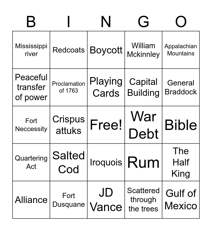 This bingo card has a free space and 33 words: King Street, 5, Crispus attuks, Militia, Quartering Act, Proclamation of 1763, Appalachian Mountains, Alliance, Redcoats, Stamp Act, Playing Cards, Boycott, Sugar Act, Townshend Act, War Debt, General Braddock, Fort Dusquane, Fort Neccessity, Salted Cod, Rum, Iroquois, West, Mississippi river, Bible, JD Vance, Gulf of Mexico, William Mckinnley, Capital Building, Peaceful transfer of power, The Half King, Straight, neat orderly lines, Scattered through the trees and Marcus.