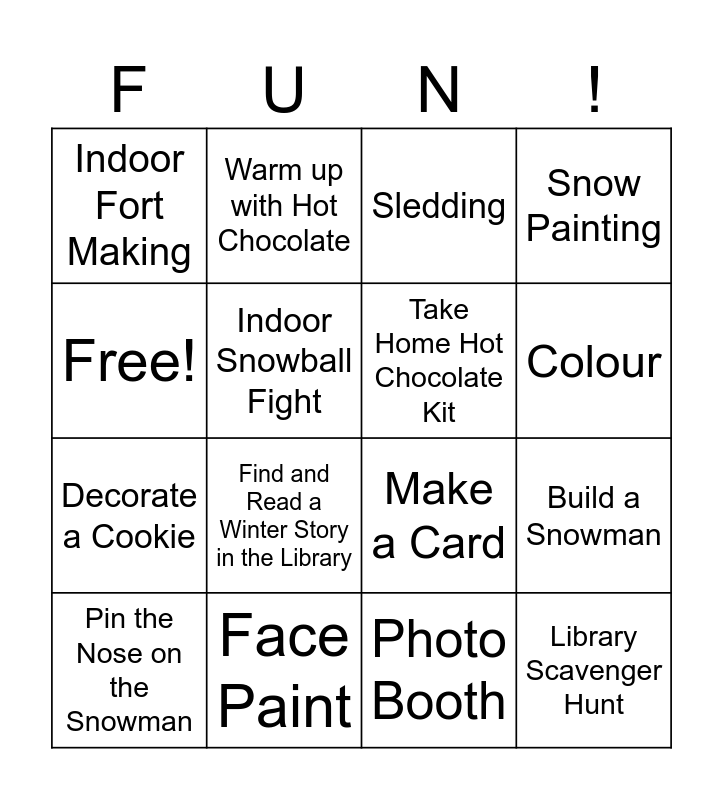 This bingo card has 16 words: Face Paint, Build a Snowman, Sledding, Indoor Fort Making, Decorate a Cookie, Warm up with Hot Chocolate, Make a Card, Photo Booth, Free!, Indoor Snowball Fight, Pin the Nose on the Snowman, Snow Painting, Find and Read a Winter Story in the Library, Colour, Take Home Hot Chocolate Kit and Library Scavenger Hunt.