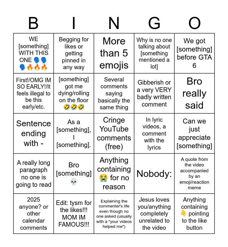 This bingo card has a free space and 24 words: Bro [something] 💀, Edit: tysm for the likes!!! MOM IM FAMOUS!!!, Several comments saying basically the same thing, 2025 anyone? or other calendar comments, We got [something] before GTA 6, WE [something] WITH THIS ONE 🗣️🗣️🗣️🔥🔥🔥, First!/OMG IM SO EARLY!/It feels illegal to be this early/etc., Begging for likes or getting pinned in any way, In lyric videos, a comment with the lyrics, Anything containing 😭 for no reason, Gibberish or a very VERY badly written comment, Sentence ending with -, Nobody:, A quote from the video accompanied by an emoji/reaction meme, [something] got me dying/rolling on the floor 🤣🤣🤣, Jesus loves you/anything completely unrelated to the video, Can we just appreciate [something], More than 5 emojis, Bro really said, As a [something], I [something]., Anything containing 👇 pointing to the like button, A really long paragraph no one is going to read, Why is no one talking about [something mentioned a lot] and Explaining the commenter's life even though no one asked (usually with a "your videos helped me").