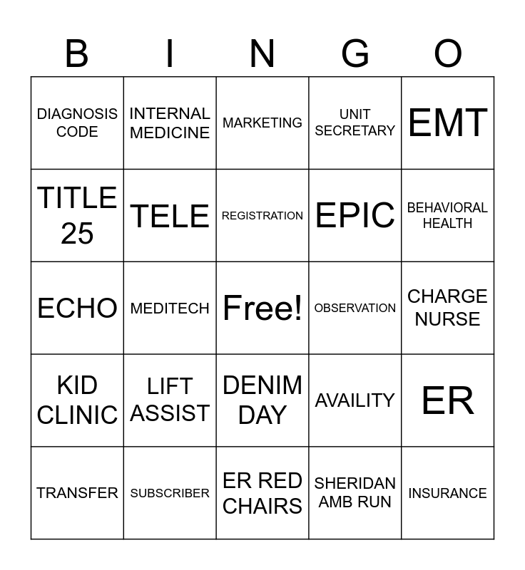 This bingo card has a free space and 109 words: OUTPATIENT, INPATIENT, OBSERVATION, LAB, RADIOLOGY, HIPPA, CONSENT, TRIAGE, EMTALA, PATIENT, ESTIMATE, SURGERY, CARDIOLOGY, WALK IN CLINIC, CT SCAN, MRI, ECHO, OPATH, OLLL, XLAB, ER, MEDICARE, MEDICAID, ELEVATE, PRE-ACCESS, REGISTRATION, EMT, NURSE, MATERNAL CHILD, NEWBORN, BEHAVIORAL HEALTH, UNIT SECRETARY, MARKETING, THE LEGACY, GUARANTOR, INSURANCE, HOUSE SUPERVISOR, PROVIDER, SUBSCRIBER, POLICY, DEMOGRAPHICS, WAYSTAR, EPIC, MEDITECH, AVAILITY, PHYSICIAN ORDER, COVERAGE, PHONE REG, DIALYSIS, LEVEL OF CARE, MEDICAL RECORDS, FACE SHEET, SHERIDAN AMB RUN, NEWCASTLE AMB RUN, AMBULANCE, CODE BLUE, FLOOR CARE, ICU, MED SURGE, TELE, DIAGNOSIS CODE, EVS, CATH LAB, BIO MED, EMPLOYEE HEALTH, HUMAN RESOURCES, INFECTIOUS DISEASE, TEAMS, PHARMACY, NICU, MAIN CLINIC, INTERNAL MEDICINE, KID CLINIC, TRAUMA, PFS, COPAY, CHARGE NURSE, COVID, ULTRASOUND, DISCHARGE, FORMFAST, SCANNING, WORK COMP, MVA, HOSP ASSISTANCE, EMERGENCY, TRIWEST, VA, TITLE 25, 1079, REFUSAL, LIFT ASSIST, TRANSPORT, WHEELCHAIR, XRAY, RAPID RESPONSE, ABDOMINAL PAIN, PULSECHECK, ER RED CHAIRS, STEMI, HMO, IMM/MOON, TRANSFER, DENIM DAY, PATIENT PORTAL, REASON FOR VISIT, POLST, ADVANCE DIRECTIVE and CLAIM CODE.