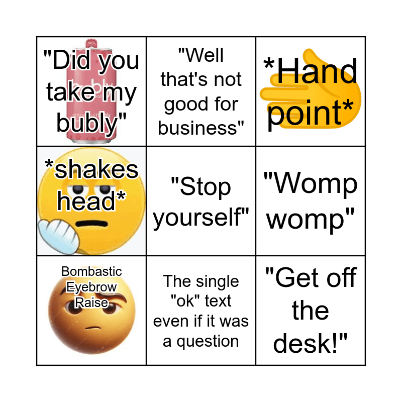 This bingo card has 4 images, a free space and 8 words: "Womp womp", *Hand point*, "Well that's not good for business", Bombastic Eyebrow Raise, "Did you take my bubly", "Get off the desk!", *shakes head* and The single "ok" text even if it was a question.