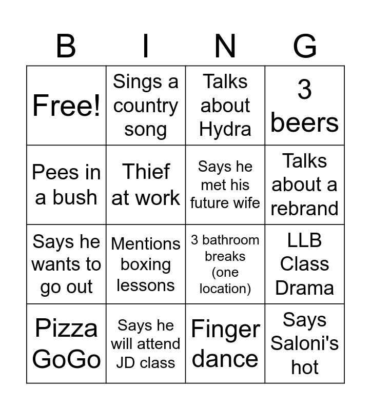 This bingo card has 18 words: Pees in a bush, Says he will attend JD class, Talks about Hydra, 3 beers, Says he wants to go out, Sings a country song, 3 bathroom breaks (one location), Talks about a rebrand, Free!, Mentions boxing lessons, Finger dance, LLB Class Drama, Pizza GoGo, Thief at work, Says he met his future wife, Says Saloni's hot, Downloaded or deleted dating apps and LLB drama.