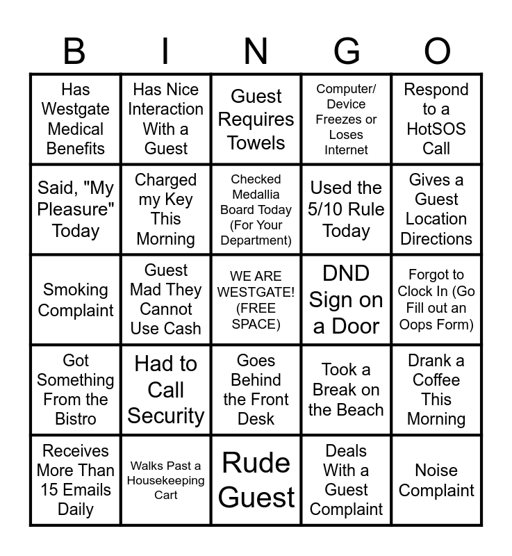 This bingo card has a free space and 44 words: Joins a Teams Meeting, Noise Complaint, Late Check Out Requested, Receives More Than 15 Emails Daily, Ate Lunch in the Break Room, Deals With a Guest Complaint, Guest Requires Towels, Guest Key Card Doesn't Work, Respond to a HotSOS Call, Walks Past a Housekeeping Cart, Computer/ Device Freezes or Loses Internet, DND Sign on a Door, Goes Behind the Front Desk, Had to Call Security, Place a Call into HotSOS, Rude Guest, TV Complaint/ Issue, Smoking Complaint, Guest Requires New Key, Gives a Guest Location Directions, Has Nice Interaction With a Guest, Worked Here for Over 5 Years, Extra Linen Requested, Has Westgate Medical Benefits, "But I am an Owner", Forgot to Clock In (Go Fill out an Oops Form), Had to File an IT Ticket, Completed Policy Training With Colleen, Took a Break on the Beach, Got Something From the Bistro, Spoke to a Team Member in a Different Department, Drank a Coffee This Morning, Drank an Energy Drink This Morning, Had to Escalate a Situation to a Manager, Guest Mad They Cannot Use Cash, Guest Complains About View, My Work Anniversary is This Month, I Know How to Look up my TM# on ADP, Checked Medallia Board Today (For Your Department), Said, "My Pleasure" Today, Used the 5/10 Rule Today, Forgot my Name Tag Today, Charged my Key This Morning and Directly Assisted a Guest Today.