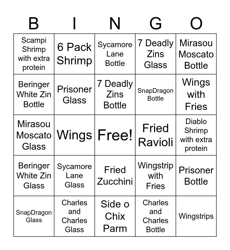 This bingo card has a free space and 24 words: Sycamore Lane Glass, Charles and Charles Glass, 7 Deadly Zins Bottle, SnapDragon Glass, Mirasou Moscato Bottle, Scampi Shrimp with extra protein, Beringer White Zin Bottle, 6 Pack Shrimp, Fried Ravioli, Fried Zucchini, SnapDragon Bottle, Mirasou Moscato Glass, Wingstrip with Fries, Prisoner Bottle, Prisoner Glass, Charles and Charles Bottle, Diablo Shrimp with extra protein, Sycamore Lane Bottle, Wings with Fries, Wings, Wingstrips, Beringer White Zin Glass, 7 Deadly Zins Glass and Side o Chix Parm.