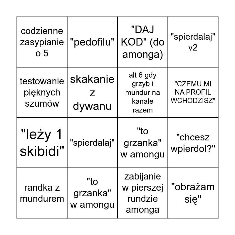 This bingo card has 18 words: "spierdalaj", "obrażam się", "DAJ KOD" (do amonga), codzienne zasypianie o 5, "to grzanka" w amongu, "spierdalaj" v2, randka z mundurem, "pedofilu", "CZEMU MI NA PROFIL WCHODZISZ", "leży 1 skibidi", zabijanie w pierszej rundzie amonga, testowanie pięknych szumów, "chcesz wpierdol?", skakanie z dywanu, alt 6 gdy grzyb i mundur na kanale razem, "zuzia", "to grzanka" w amongu and skakanie z dywanu.