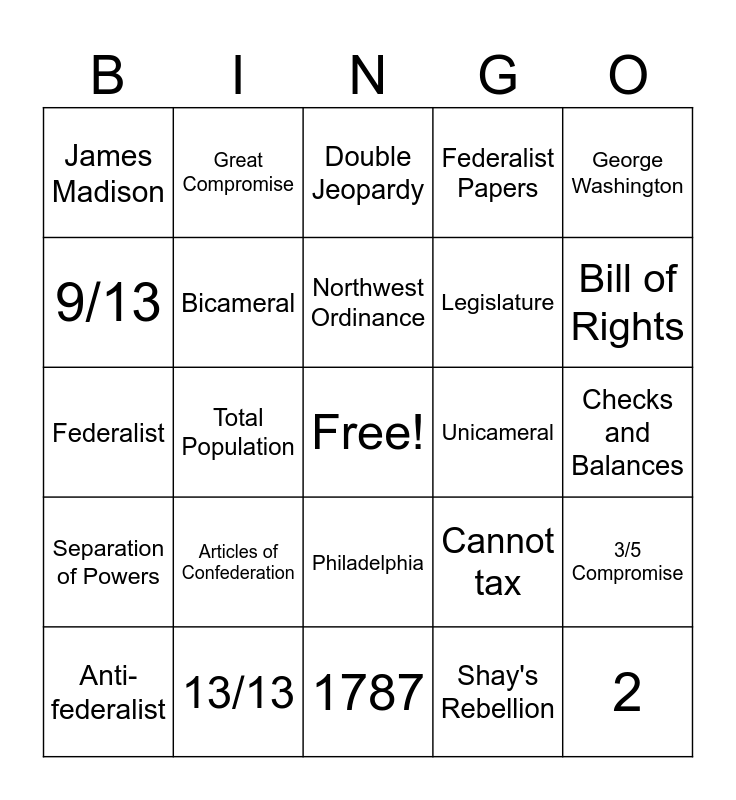 This bingo card has a free space and 24 words: Articles of Confederation, 13/13, Northwest Ordinance, Anti-federalist, George Washington, James Madison, 9/13, Great Compromise, Unicameral, Philadelphia, Legislature, Federalist, Cannot tax, 3/5 Compromise, Bicameral, Shay's Rebellion, Checks and Balances, Double Jeopardy, Bill of Rights, Total Population, 2, Separation of Powers, Federalist Papers and 1787.