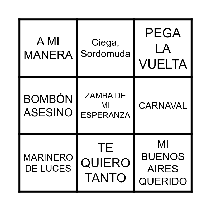 This bingo card has a free space and 23 words: LUNA TUCUMANA, GARGANTA CON ARENA, ROSA, ROSA, A DON ATA, MI BUENOS AIRES QUERIDO, A MI MANERA, TE QUIERO TANTO, PEGA LA VUELTA, AMOR SALVAJE, QUE NADIE SEPA MI SUFRIR, LA POLLERA AMARILLA, BOMBÓN ASESINO, ZAMBA PARA OLVIDARTE, ETERNO AMOR, VIVIR ASÍ ES MORIR DE AMOR, DESPEINADA, CARNAVAL, MARINERO DE LUCES, DAME FUEGO, This is me, Ciega, Sordomuda, La canción del velero and Let's get loud.