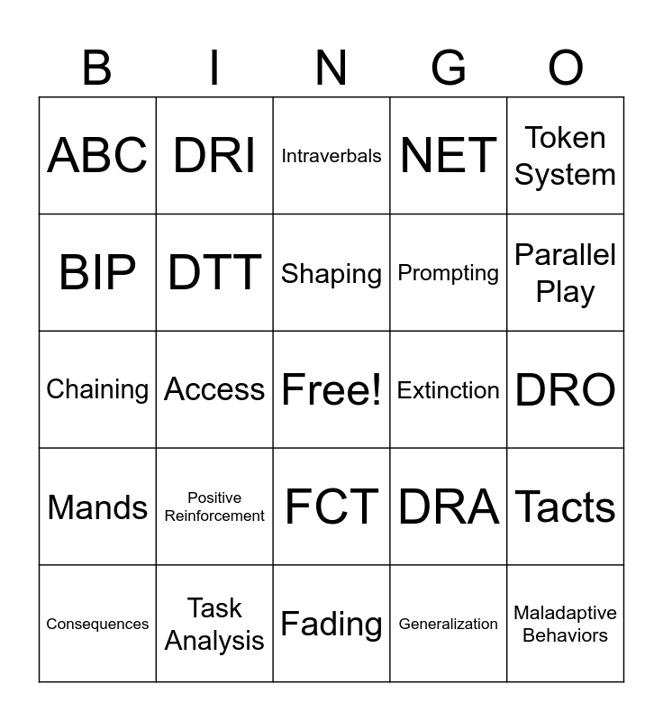 This bingo card has a free space and 24 words: Positive Reinforcement, Task Analysis, Shaping, Consequences, Token System, ABC, BIP, DRI, Extinction, FCT, Prompting, Chaining, DRA, Tacts, DTT, Generalization, DRO, Intraverbals, Parallel Play, Access, Maladaptive Behaviors, Mands, NET and Fading.
