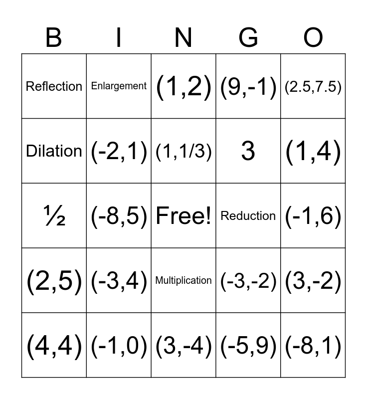 This bingo card has a free space and 25 words: (-3,4), (3,-4), (1,1/3), (4,4), (2.5,7.5), Reflection, Dilation, Enlargement, Reduction, Multiplication, 3, ½, (-3,-2), (3,-2), (-2,1), (-5,-1), (-1,6), (1,2), (1,4), (-8,5), (-8,1), (-1,0), (2,5), (9,-1) and (-5,9).
