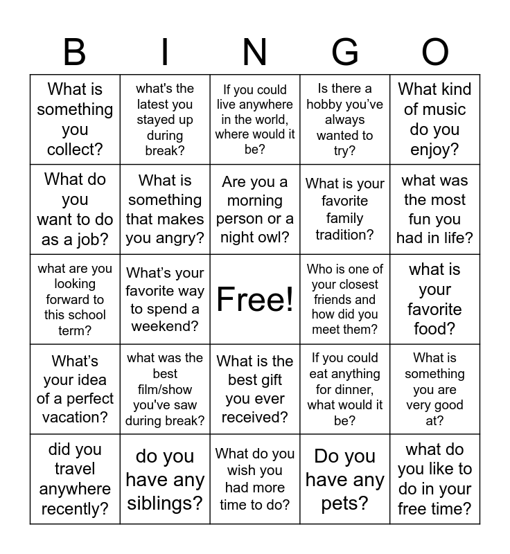 This bingo card has a free space and 24 words: what was the best film/show you've saw during break?, do you have any siblings?, Are you a morning person or a night owl?, did you travel anywhere recently?, What kind of music do you enjoy?, What is something you collect?, What do you want to do as a job?, what's the latest you stayed up during break?, Who is one of your closest friends and how did you meet them?, What is the best gift you ever received?, What is your favorite family tradition?, what are you looking forward to this school term?, If you could eat anything for dinner, what would it be?, What is something you are very good at?, What is something that makes you angry?, Do you have any pets?, what is your favorite food?, If you could live anywhere in the world, where would it be?, what was the most fun you had in life?, What’s your favorite way to spend a weekend?, what do you like to do in your free time?, What’s your idea of a perfect vacation?, Is there a hobby you’ve always wanted to try? and What do you wish you had more time to do?.