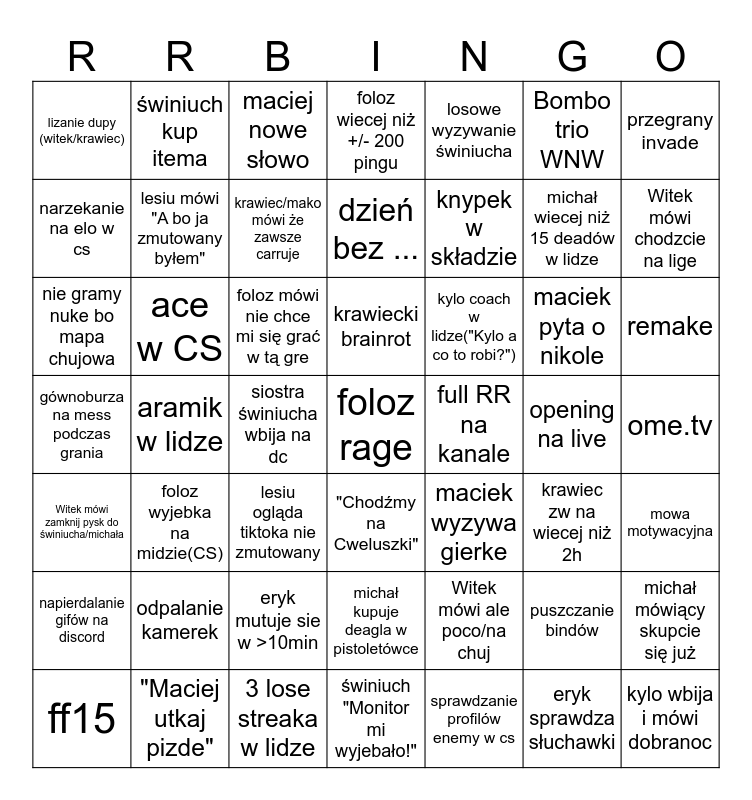 This bingo card has a free space and 48 words: Witek mówi ale poco/na chuj, michał wiecej niż 15 deadów w lidze, świniuch "Monitor mi wyjebało!", aramik w lidze, foloz mówi nie chce mi się grać w tą gre, ome.tv, świniuch kup itema, "Maciej utkaj pizde", Bombo trio WNW, "Chodźmy na Cweluszki", przegrany invade, foloz wiecej niż +/- 200 pingu, maciek pyta o nikole, kylo coach w lidze("Kylo a co to robi?"), napierdalanie gifów na discord, opening na live, narzekanie na elo w cs, Witek mówi chodzcie na lige, puszczanie bindów, losowe wyzywanie świniucha, knypek w składzie, siostra świniucha wbija na dc, lizanie dupy (witek/krawiec), lesiu mówi "A bo ja zmutowany byłem", michał mówiący skupcie się już, krawiec/mako mówi że zawsze carruje, remake, ff15, krawiecki brainrot, ace w CS, eryk sprawdza słuchawki, full RR na kanale, mowa motywacyjna, odpalanie kamerek, gównoburza na mess podczas grania, maciek wyzywa gierke, krawiec zw na wiecej niż 2h, nie gramy nuke bo mapa chujowa, lesiu ogląda tiktoka nie zmutowany, eryk mutuje sie w >10min, Witek mówi zamknij pysk do świniucha/michała, kylo wbija i mówi dobranoc, maciej nowe słowo, 3 lose streaka w lidze, dzień bez ..., michał kupuje deagla w pistoletówce, foloz wyjebka na midzie(CS) and sprawdzanie profilów enemy w cs.