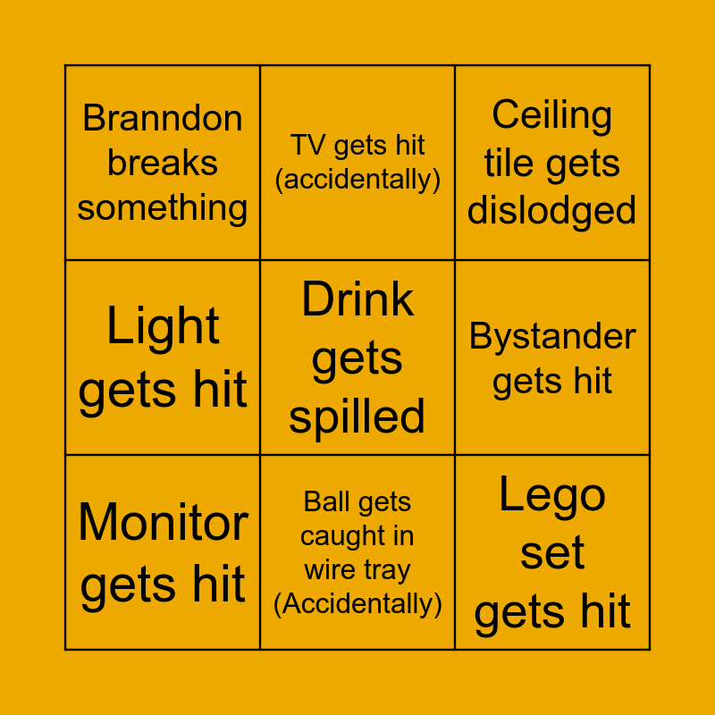 This bingo card has 9 words: Monitor gets hit, Ceiling tile gets dislodged, TV gets hit (accidentally), Light gets hit, Branndon breaks something, Bystander gets hit, Drink gets spilled, Lego set gets hit and Ball gets caught in wire tray (Accidentally).
