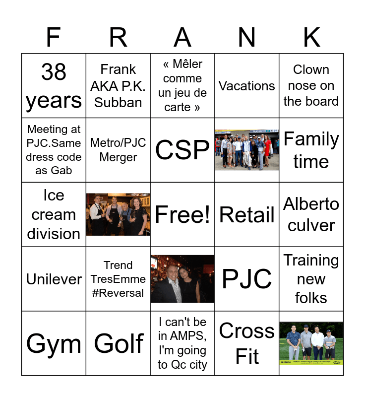 This bingo card has 4 images, a free space and 20 words: Gym, Trend TresEmme #Reversal, CSP, Cross Fit, Clown nose on the board, 38 years, Frank AKA P.K. Subban, « Mêler comme un jeu de carte », Retail, Alberto culver, Ice cream division, Metro/PJC Merger, PJC, Training new folks, Meeting at PJC.Same dress code as Gab, Golf, I can't be in AMPS, I'm going to Qc city, Vacations, Family time and Unilever.