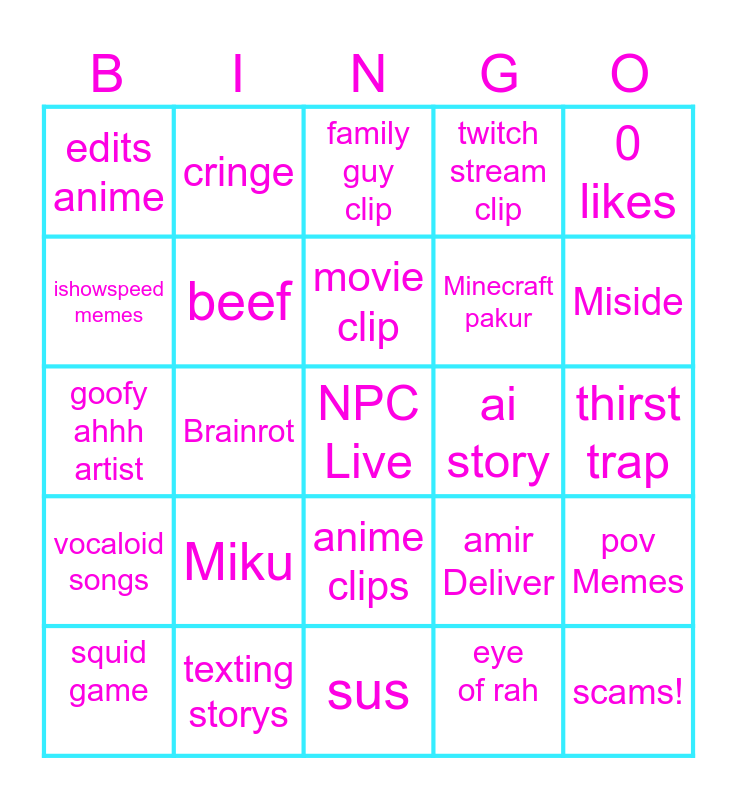 This bingo card has a free space and 24 words: Miku, texting storys, movie clip, squid game, 0 likes, edits anime, ishowspeed memes, cringe, ai story, anime clips, Minecraft pakur, goofy ahhh artist, amir Deliver, pov Memes, beef, eye of rah, thirst trap, family guy clip, Miside, Brainrot, scams!, vocaloid songs, twitch stream clip and sus.
