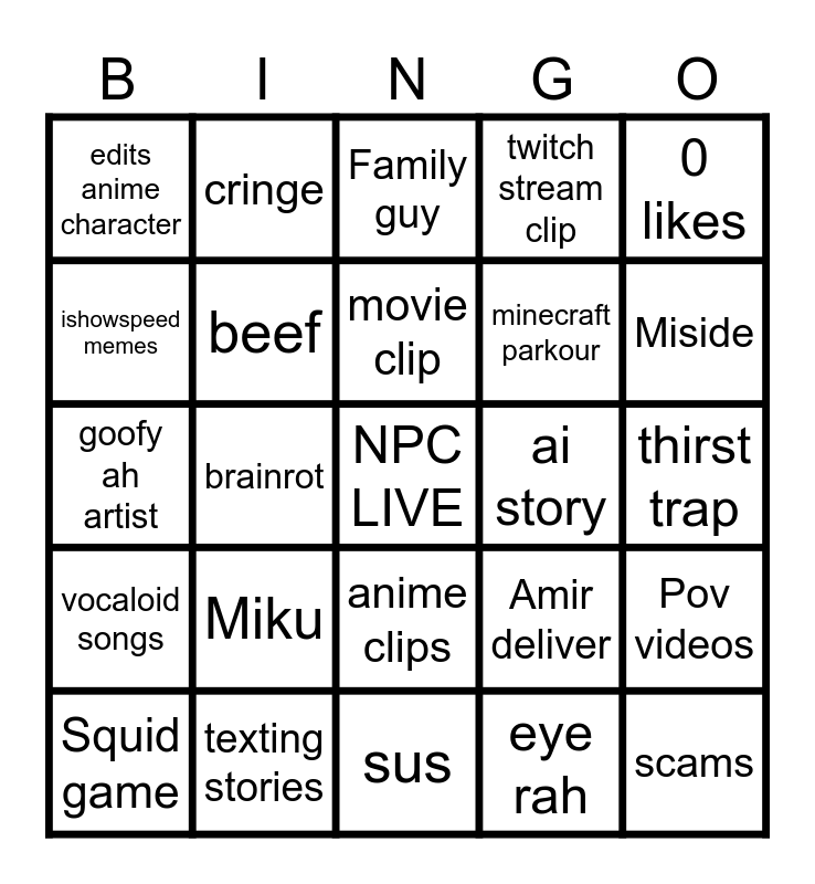 This bingo card has a free space and 24 words: Miku, texting stories, movie clip, Squid game, 0 likes, edits anime character, ishowspeed memes, cringe, ai story, anime clips, minecraft parkour, goofy ah artist, Amir deliver, Pov videos, beef, eye rah, thirst trap, Family guy, Miside, brainrot, scams, vocaloid songs, twitch stream clip and sus.