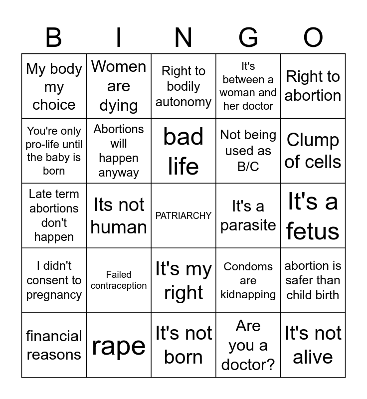 This bingo card has a free space and 30 words: rape, Medical exception, Its not human, You're a man, My body my choice, Right to bodily autonomy, Abortions will happen anyway, It's my right, It's a parasite, It's not born, It's a fetus, It's not alive, Are you a doctor?, Masturbation's murder, Clump of cells, Children forced pregnancy, Condoms are kidnapping, I didn't consent to pregnancy, Failed contraception, Right to abortion, Late term abortions don't happen, Abortion is healthcare, Women are dying, Not being used as B/C, You're only pro-life until the baby is born, It's between a woman and her doctor, abortion is safer than child birth, financial reasons, bad life and do you adopt?.