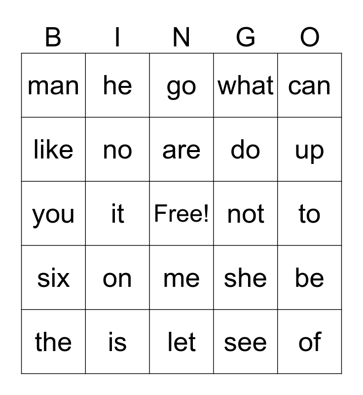 This bingo card has a free space and 29 words: the, I, it, ran, man, go, no, on, not, is, to, of, let, see, up, we, me, six, can, you, she, that, do, like, what, he, be, are and play.