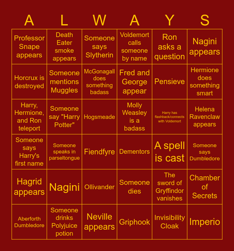 This bingo card has 50 words: You see the snitch, Harry, Hermione, and Ron teleport, Anyone disapparates, A spell is cast, Harry has flashback/connects with Voldemort, Someone drinks Polyjuice potion, Death Eater smoke appears, someones pulls item out of Hermione's bag, Nagini appears, Neville appears, Horcrux is destroyed, Voldemort calls someone by name, Someone speaks in parseltongue, Someone says Harry's first name, Someone says Harry's first and last name, Someone dies, Someone mentions Muggles, Someone say "Harry Potter", Someone says "Horcrux", Ron asks a question, Hermione does something smart, Someone says Dumbledore, Professor Snape appears, McGonagall does something badass, Draco Malfoy, Hagrid appears, Fred and George appear, Neville Longbottom is a badass, Someone says Slytherin, Helena Ravenclaw appears, Professor Flitwick casts a spell, The sword of Gryffindor vanishes, Someone says Lord Voldemort, Gringotts, Dementors, Ollivander, Griphook, Invisibility Cloak, Imperio, Hogsmeade, Aberforth Dumbledore, The Great Hall, Chamber of Secrets, Death Eaters, Fiendfyre, Pensieve, Nagini, Expelliarmus, Molly Weasley is a badass and Someone mentions half-bloods.