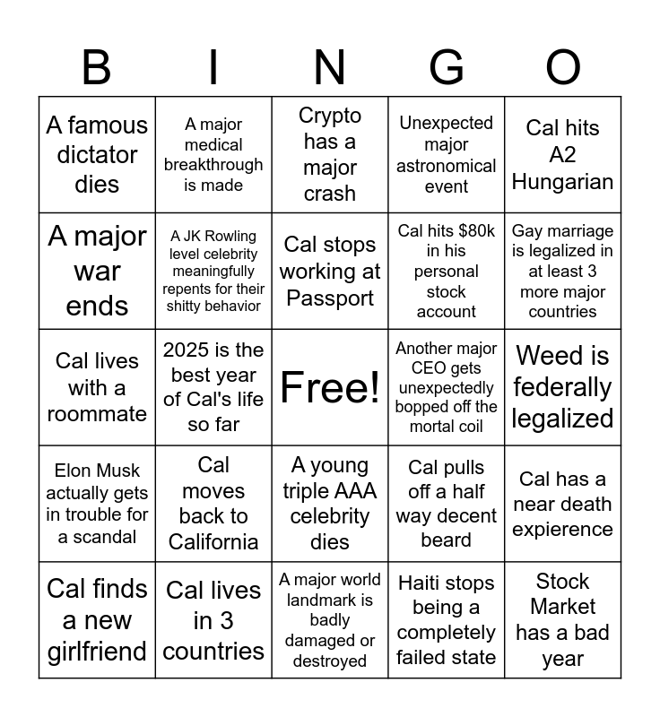 This bingo card has a free space and 24 words: Cal moves back to California, Cal lives in 3 countries, Cal stops working at Passport, Cal finds a new girlfriend, Cal hits A2 Hungarian, A famous dictator dies, A major war ends, A major medical breakthrough is made, Another major CEO gets unexpectedly bopped off the mortal coil, A young triple AAA celebrity dies, Cal hits $80k in his personal stock account, Cal lives with a roommate, Cal pulls off a half way decent beard, Cal has a near death expierence, A JK Rowling level celebrity meaningfully repents for their shitty behavior, Haiti stops being a completely failed state, Weed is federally legalized, Crypto has a major crash, Gay marriage is legalized in at least 3 more major countries, 2025 is the best year of Cal's life so far, Stock Market has a bad year, Elon Musk actually gets in trouble for a scandal, Unexpected major astronomical event and A major world landmark is badly damaged or destroyed.