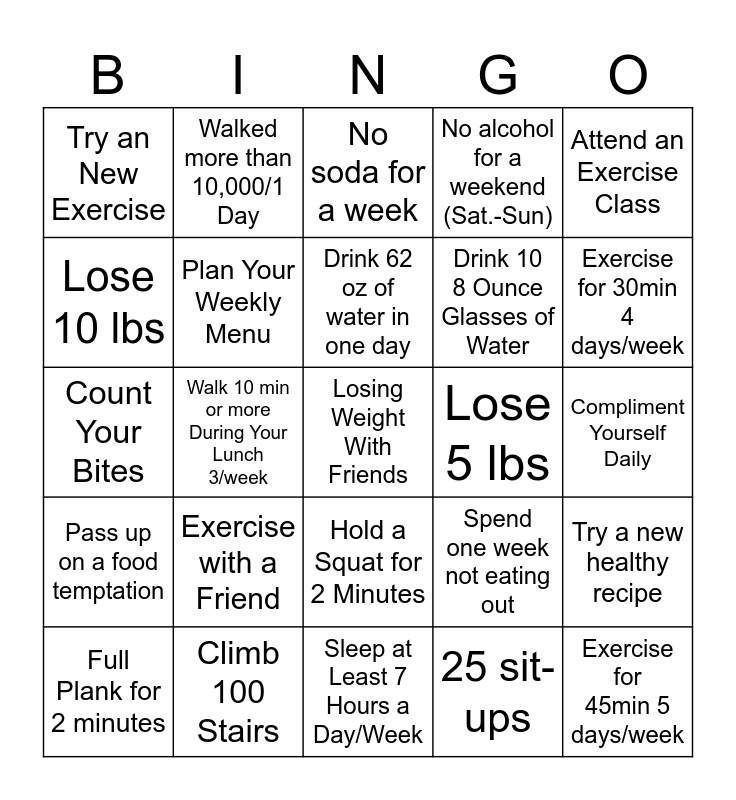 This bingo card has a free space and 24 words: Exercise with a Friend, Climb 100 Stairs, Drink 62 oz of water in one day, Full Plank for 2 minutes, Attend an Exercise Class, Try an New Exercise, Lose 10 lbs, Walked more than 10,000/1 Day, Lose 5 lbs, Hold a Squat for 2 Minutes, Drink 10 8 Ounce Glasses of Water, Count Your Bites, Spend one week not eating out, Try a new healthy recipe, Plan Your Weekly Menu, 25 sit-ups, Compliment Yourself Daily, No soda for a week, Exercise for 30min 4 days/week, Walk 10 min or more During Your Lunch 3/week, Exercise for 45min 5 days/week, Pass up on a food temptation, No alcohol for a weekend (Sat.-Sun) and Sleep at Least 7 Hours a Day/Week.