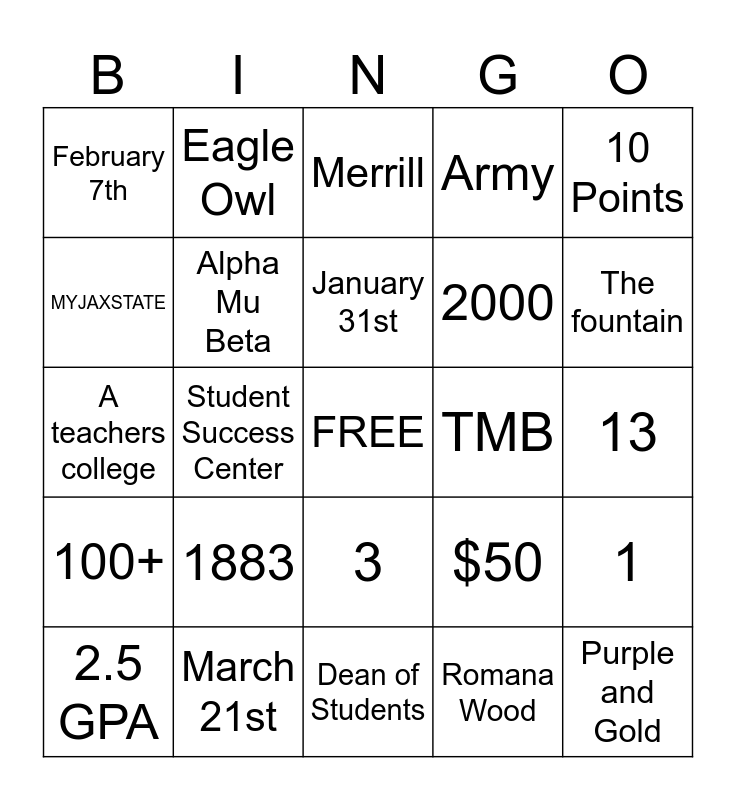 This bingo card has a free space and 24 words: 1883, March 21st, January 31st, 2.5 GPA, 10 Points, February 7th, MYJAXSTATE, Eagle Owl, TMB, 3, 2000, A teachers college, $50, 1, Alpha Mu Beta, Romana Wood, 13, Merrill, The fountain, Student Success Center, Purple and Gold, 100+, Army and Dean of Students.