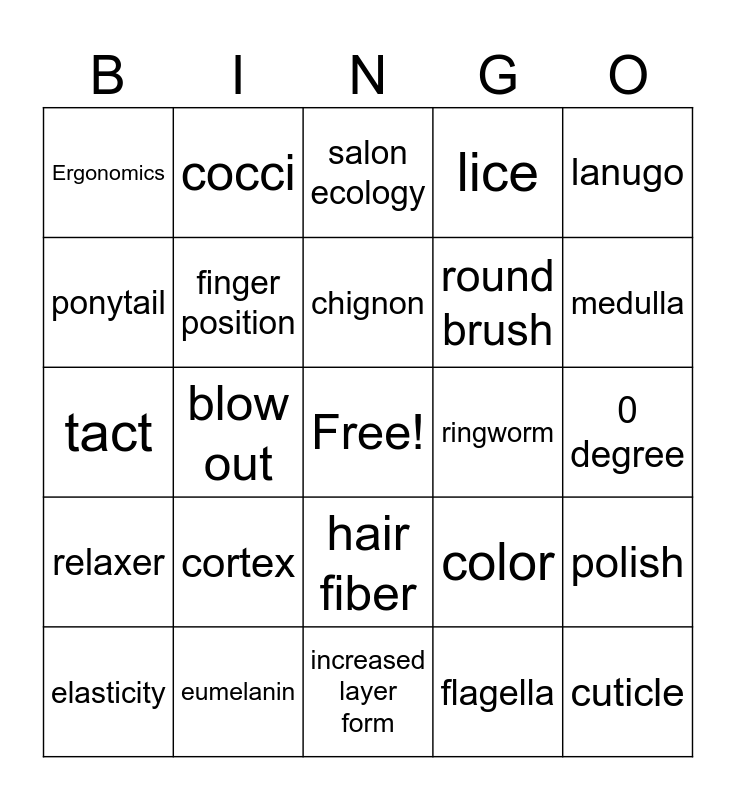 This bingo card has a free space and 44 words: universal precautions, cuticle, catagen, elasticity, 90 degree, flagella, salon ecology, solid form, lanugo, eumelanin, lice, ringworm, hair fiber, cortex, arector pili, increased layer form, streptococci, tact, telogen, medulla, cocci, FDA, Sterilization, Ergonomics, 180 degree, 0 degree, 45 degree, perm, color, relaxer, nail, polish, 3 strand over braid, up do, blow out, hair spray, gel, French twist, chignon, ponytail, round brush, flat iron, finger position and rollers.