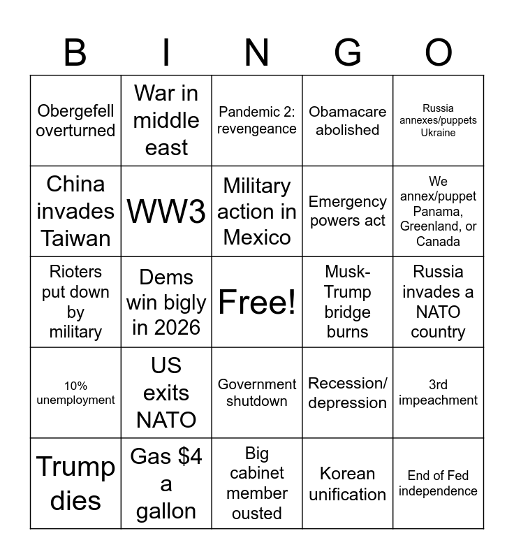 This bingo card has a free space and 24 words: US exits NATO, Gas $4 a gallon, Military action in Mexico, Trump dies, Russia annexes/puppets Ukraine, Obergefell overturned, China invades Taiwan, War in middle east, Musk-Trump bridge burns, Government shutdown, Emergency powers act, Rioters put down by military, Recession/ depression, 3rd impeachment, WW3, Korean unification, Russia invades a NATO country, Pandemic 2: revengeance, We annex/puppet Panama, Greenland, or Canada, Dems win bigly in 2026, End of Fed independence, 10% unemployment, Obamacare abolished and Big cabinet member ousted.