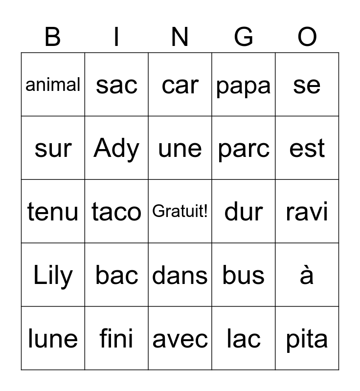 This bingo card has a free space and 32 words: lac, duc, taco, aime, Lily, Ady, se, à, sac, silo, une, car, tir, mur, dur, au, lune, tenu, dans, bac, bus, bravo, ravi, fini, pita, papa, parc, sur, animal, avec, aime and est.