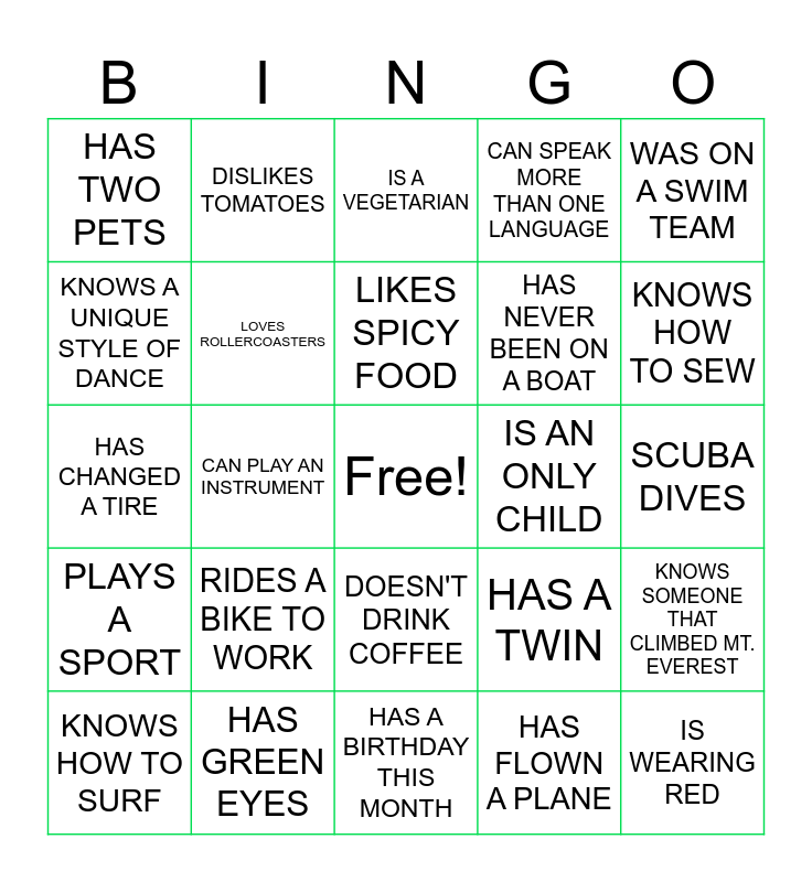 This bingo card has a free space and 24 words: RIDES A BIKE TO WORK, HAS GREEN EYES, LIKES SPICY FOOD, KNOWS HOW TO SURF, WAS ON A SWIM TEAM, HAS TWO PETS, KNOWS A UNIQUE STYLE OF DANCE, DISLIKES TOMATOES, IS AN ONLY CHILD, DOESN'T DRINK COFFEE, HAS NEVER BEEN ON A BOAT, HAS CHANGED A TIRE, HAS A TWIN, KNOWS SOMEONE THAT CLIMBED MT. EVEREST, LOVES ROLLERCOASTERS, HAS FLOWN A PLANE, SCUBA DIVES, IS A VEGETARIAN, KNOWS HOW TO SEW, CAN PLAY AN INSTRUMENT, IS WEARING RED, PLAYS A SPORT, CAN SPEAK MORE THAN ONE LANGUAGE and HAS A BIRTHDAY THIS MONTH.